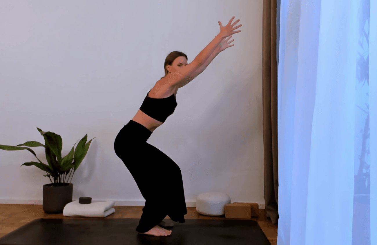 Za manjšo intenzivnost položaja lahko ohraniš dlani v pasu ali pa jih skeleš na prsnem košu v anjali mudro. Položaj lahko izvajaš tudi s podporo stola, tako da se tvoja zadnjica čisto rahlo dotakne stola.