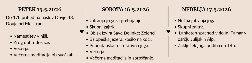 Pridruži se ženskemu vikendu Holy Hiking & Yoga v čarobni alpski vasici Dovje. Tri dni sprostitve, joge, meditacije in nežnih pohodov v objemu Julijskih Alp. Dovoli si odklop, poveži telo, dih in srce – in se vrni domov z novo energijo.